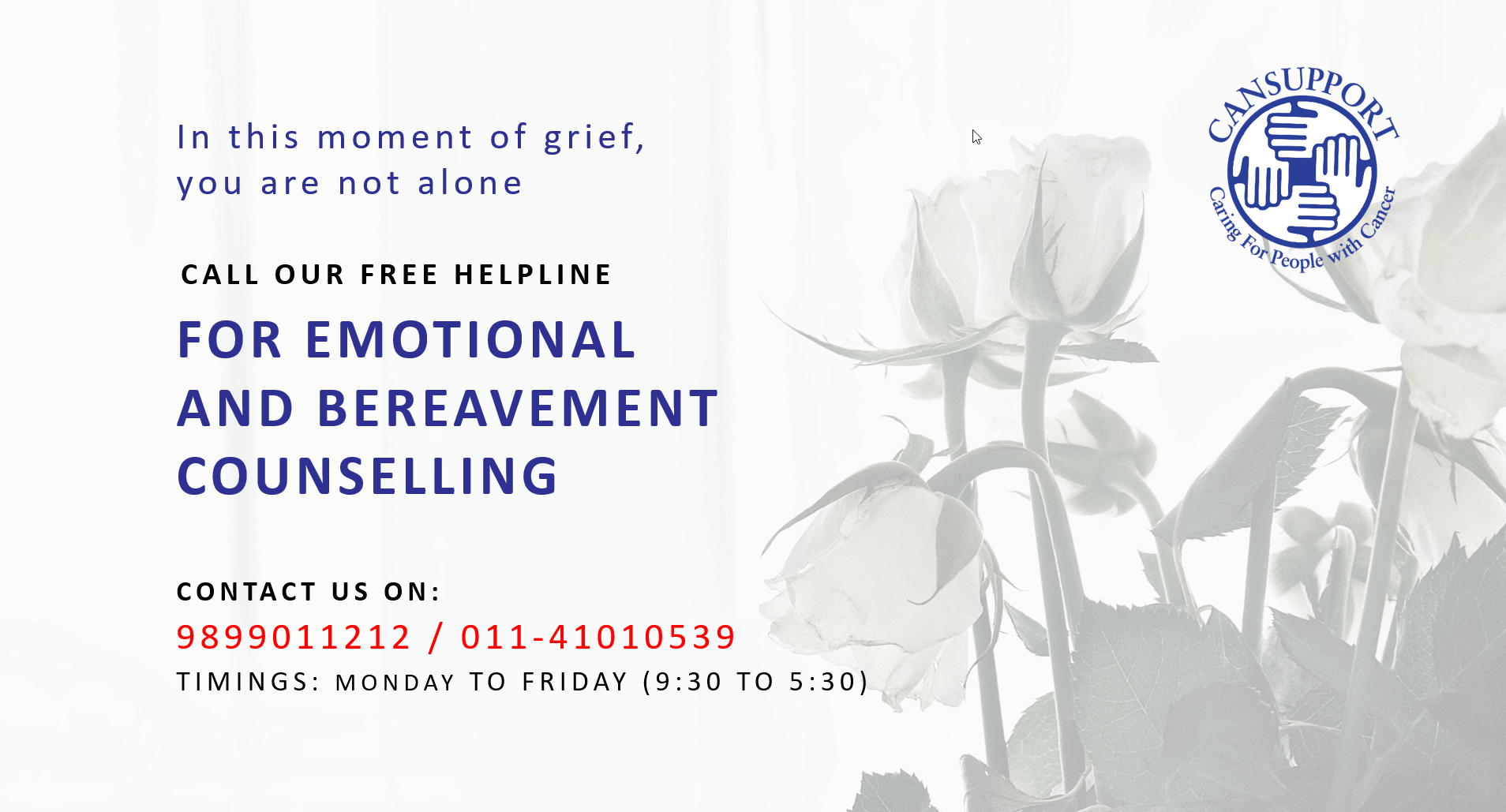 CanSupport Helpline: +91-11-41010539 / +91-9899011212 Monday to Saturday - 9am to 6pmSaath Saath National Palliative Care Helpline: 1800-202-7777, Monday to Saturday - 10 am to 6 pm