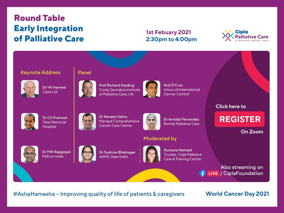 CanSupport on behalf of Cipla Palliative Care & Training Centre invites its supporters, donors, well-wisher, doctors, healthcare practitioners to attend the upcoming round table webinar on “Early Integration of Palliative Care” to be held on Monday, 1 February 2021 from 2: 30 pm to 4:00 pm.