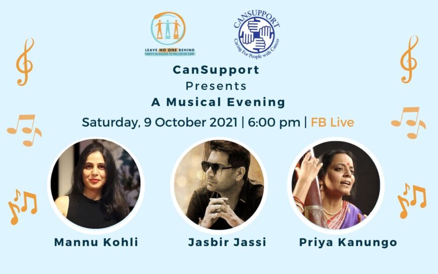 On Saturday, 9 October 2021, CanSupport is celebrating World Hospice and Palliative Care Day by organizing a musical evening live on its Facebook Page from 6:00 pm – 7:00 pm. This year CanSupport is excited to share that the musical evening will showcase performances by renowned artists such as Jasbir Jassi, Mannu Kohli and Priya Kanungo.