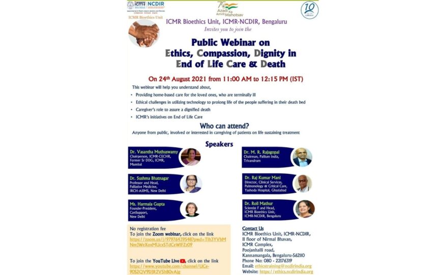 On 24 August 2021, ICMR Bioethics Unit, ICMR-NCDIR, Bengaluru organised a Public Webinar on Ethics, Compassion, Dignity in End-of-Life Care & Death.